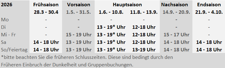 Diese Zeiten stellen schematisch die Öffnungszeiten dar. Witterungsbedingte und durch Kundenbuchungen/Seilbahnmieten können hier Abweichungen sein.